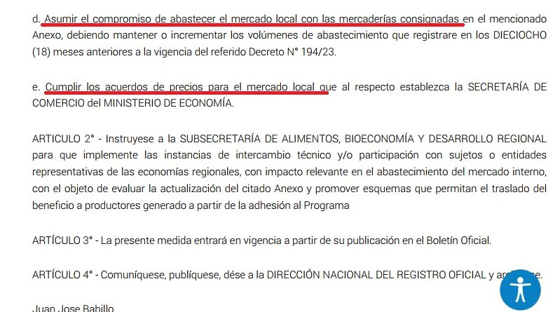 Otro de los puntos señala que las firmas deben “cumplir los acuerdos de precios para el mercado local que al respecto establezca la SECRETARÍA DE COMERCIO del MINISTERIO DE ECONOMÍA”.