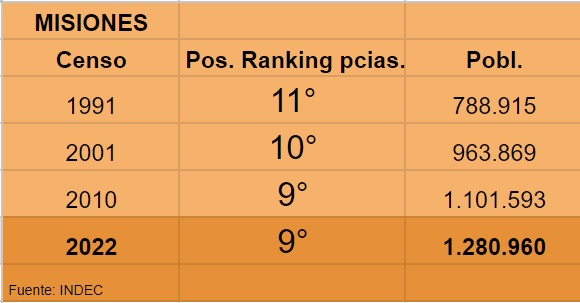 Misiones es la 9°provincia más poblada del país. Por primera vez en los últimos cuatro censos, no escala posiciones. En 1991 era la 11° más poblada. Sin embargo, la población creció 16,3% en 2022 vs el censo anterior (en 2010 creció 14,3% vs censo 1991). Pero el último censo se realizó 12 años después por el Covid 19.