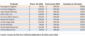 Por ejemplo, la leche (cartón) costó 114 pesos hace un año y medio y ahora está en 445 pesos. Es decir, un incremento de 290% en la góndola de California.
