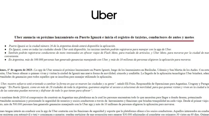 “La app de Uber anuncia el próximo lanzamiento en Puerto Iguazú, luego de los lanzamientos en Bariloche, Ushuaia y San Martín de los Andes. Con esta decisión, Uber busca ofrecer a quienes viven y visitan la ciudad de Iguazú una nueva forma de movilidad, cómoda y confiable. La llegada de la aplicación tecnológica Uber brindará, además, oportunidades de ganancias para todos aquellos que se inscriban para manejar utilizando la aplicación”, explica.