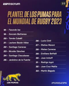 El full back misionero Martin Bogado, surgido de Centro de Cazadores y hoy en el club Highlanders de Nueva Zelanda, finalmente se metió en la lista de los 33 convocados por el entrenador Michael Cheika para disputar el Mundial de Rugby Francia 2023.