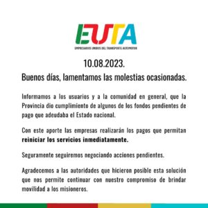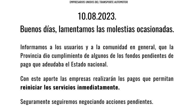 El gobierno provincial y las empresas aglutinadas en EUTA llegaron a un acuerdo para el giro de fondos que permitan hacer frente al pago de los salarios por lo cual se espera que en las próximas horas los colectivos vuelvan a funcionar normalmente.