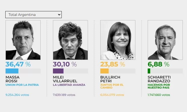 Massa sacó el 36% de los votos, Milei el 30% y Patricia Bullrich terminó 3°,cómoda con 23%. En tanto, Juan Schiaretti hizo una muy buena elección y sacó 7% lo que lo posiciona como un referente a ser seducido por los dos competidores en la segunda vuelta. El balotaje será el próximo domingo 19 de noviembre.