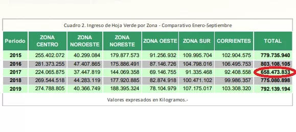 La caída de hoja verde en 2023 representa aproximadamente un 10 por ciento menos que el año pasado, cuando se cosecharon 812 millones de kilos para el mismo período.