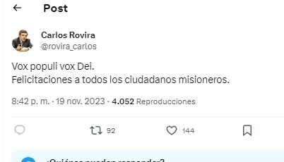 “Felicitaciones a todos los misioneros”, agregó el titular de la Legislatura, que apostó fuerte en su alianza con Sergio Massa.