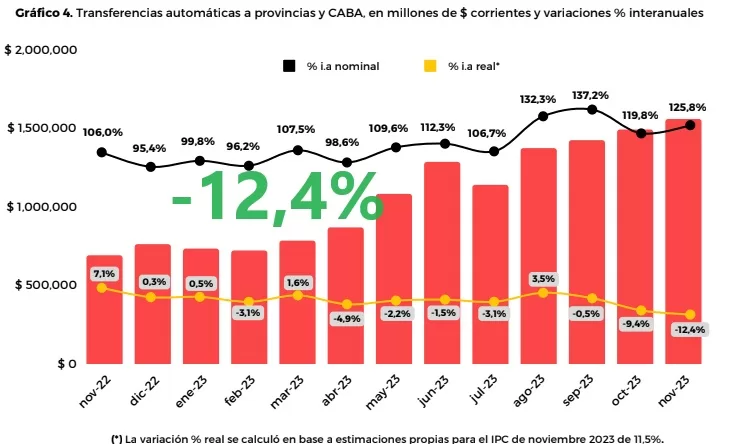 “Esta caída es explicada por un menor desempeño en la recaudación real del IVA debido a cambios en relación a la administración tributaria sobre percepciones aduaneras y al mal desempeño de la recaudación del impuesto a las ganancias producto de la reciente reforma de la cuarta categoría”, coincidió el análisis del IARAF, el Instituto Argentina de Análisis Fiscal, que también emitió un informe reportando el desplome de los giros a las provincias en noviembre.