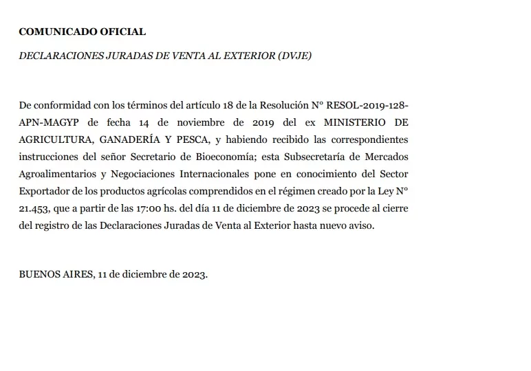 “De conformidad con los términos del artículo 18 de la resolución N° RESOL-2019-128- APN-MAGYP de fecha 14 de noviembre de 2019 del ex-Ministerio de Agricultura, Ganadería y Pesca, y habiendo recibido las correspondientes instrucciones del señor Secretario de Bioeconomía; esta Subsecretaría de Mercados Agroalimentarios y Negociaciones Internacionales pone en conocimiento del Sector Exportador de los productos agrícolas comprendidos en el régimen creado por la ley N° 21.453, que a partir de las 17.00 del día 11 de diciembre de 2023 se procede al cierre del registro de las Declaraciones Juradas de Venta al Exterior hasta nuevo aviso”, dice la comunicación oficial de esa cartera.