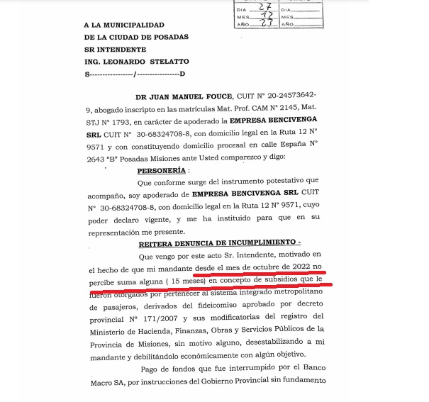 La empresa Bencivenga, que tiene la concesión de varias línea de colectivos en Posadas, intimó al intendente Leonardo “Lalo” Stelatto y al ministro de Hacienda, Adolfo Safrán, a que efectivicen el pago de 15 meses de subsidios adeudados.