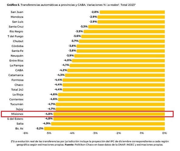 En el transcurso del año 2023, la provincia de Misiones experimentó una disminución del 4,8% en sus ingresos a través de la Coparticipación Federal de Impuestos, la cual constituye su principal fuente de financiamiento. Este descenso se enmarca en el contexto de una caída generalizada de las transferencias automáticas de recursos de origen nacional a las provincias y a la Ciudad Autónoma de Buenos Aires (CABA), según un informe de la consultora Politikon Chaco.