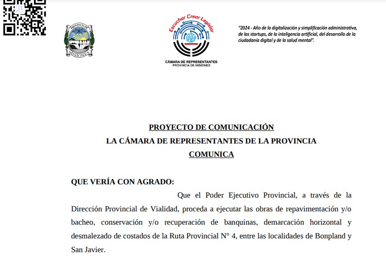 “Pedimos al Gobierno que arbitre las medidas para que se pueda mejorar la ruta, pavimentar, el bacheo, banquina y desmalezado en especial en el tramo entre Bonpland y San Javier”, explicó Castro.