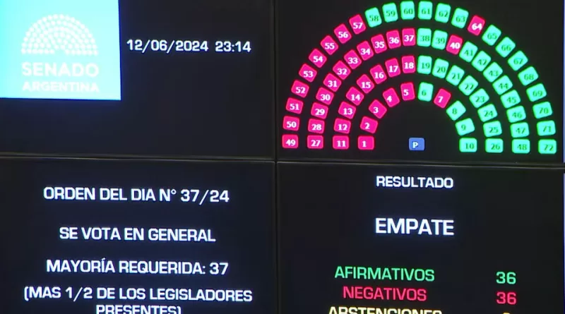 El momento culminante llegó tras trece horas de un extenuante debate, cuando en medio de la expectativa de todos los presentes en el recinto, el tablero de la Cámara alta marcó 36 votos a favor y 36 en contra.