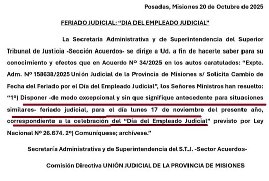 Con la firma de la Superintendencia Administrativa del Superior Tribunal de Justicia, se corrió el feriado por el “Día del Empleado Judicial” que cada año cae el 16 de noviembre. Este año ese día es domingo, pero ahora con el corrimiento al lunes 17 de noviembre, “de modo excepcional y sin que signifique antecedente para situaciones similares”, los judiciales tendrán otro finde largo XXL (del sábado 15 al lunes 17 de noviembre).