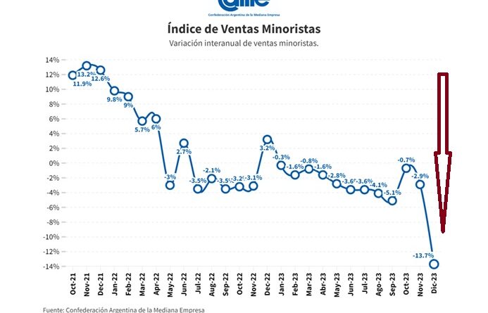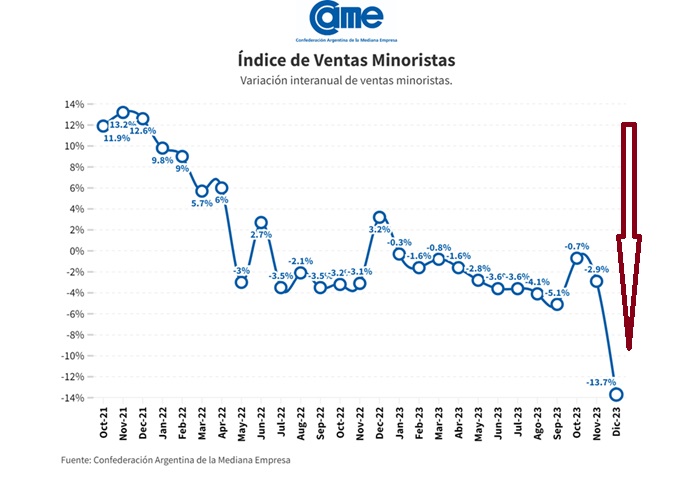 “En diciembre, las ventas minoristas pymes tuvieron un derrumbe anual de 13,7%, en la medición a precios constantes, y finalizaron el año con una retracción de 3,4%. En la comparación mensual descendieron 11,2%”, indicó CAME.