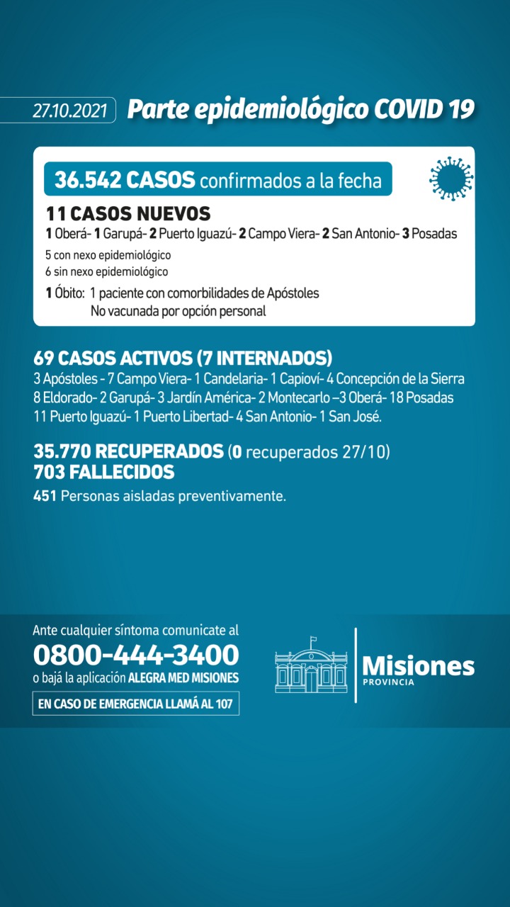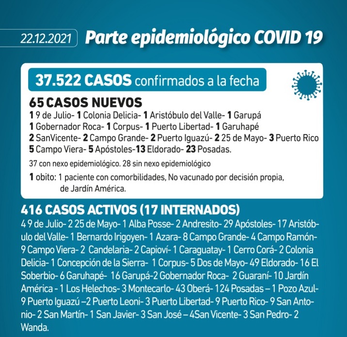 Coronavirus: Se reportó hoy un fallecido en Apóstoles que tenía morbilidades pero no había aceptado vacunarse