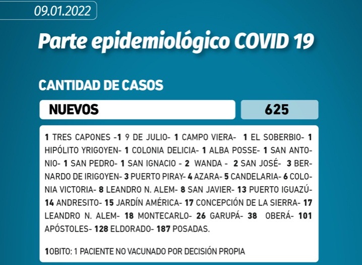 Nuevo récord de casos el domingo 9/1 con 625 y otro fallecido sin vacuna
